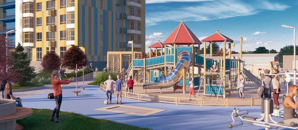 В одной расположена детская площадка с качелями, большим игровым комплексом и