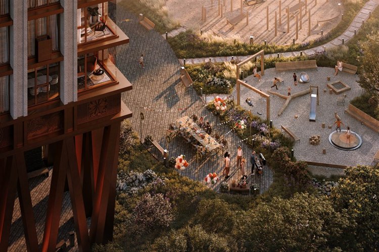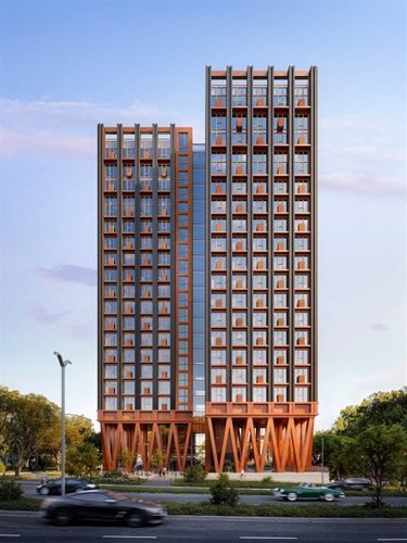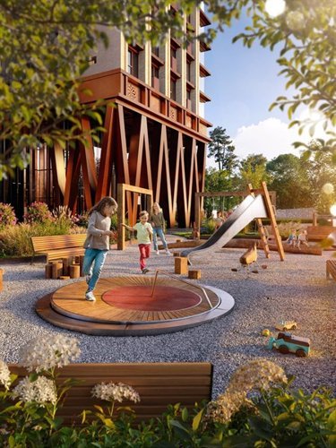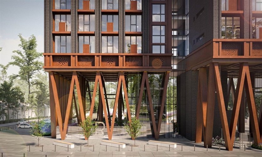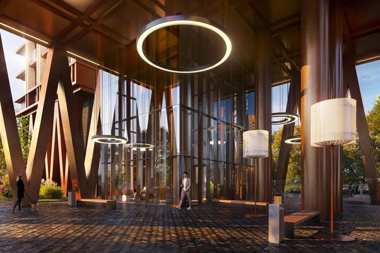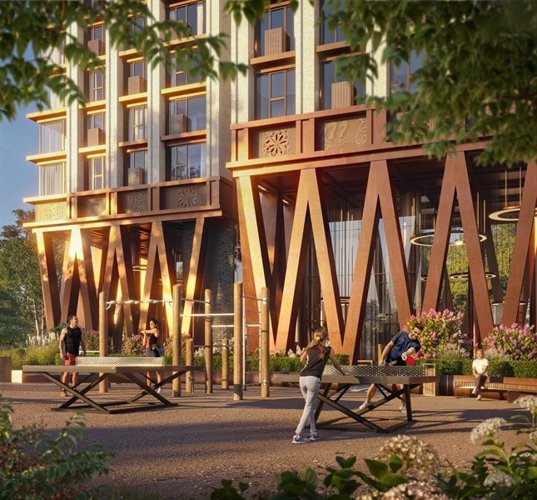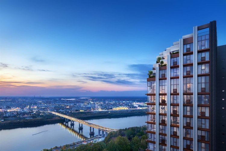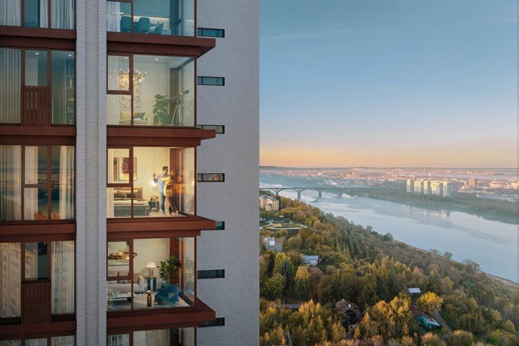 Современные дома бизнес-класса, развитая инфраструктура и близость основных транспортных артерий, зелёные зоны и панорамные виды на реку — всё это создаёт гармоничное пространство для жизни. В пешей доступности от дома находятся продуктовые магазины и аптеки, спортивные и оздоровительные учреждения, школы и детские сады.В основу архитектурной концепции дома легла идея проницаемости: света, воздуха и видов. Для того, чтобы из каждой квартиры можно было любоваться живописной панорамой, жилые этажи приподняты над землей на 10 метров. Ножки-опоры, в стиле модернистской архитектуры Ле-Корбюзье, облицованы кортеновой сталью. В сердце здания — панорамный вестибюль с высокими, десятиметровыми потолками и лифт со стеклянными стенами: из них открывается вид на город и Оку.В основе дизайн-кода дома лежит гармоничное сочетание материалов и фактур. Первое впечатление задаёт обилие остекления. В зеркальных поверхностях эффектно отражается небо и водная гладь. Особенную выразительность образу придаёт контрастная цветовая палитра. К реке дом обращён фасадом из светлого кирпича, а к историческому центру — сдержанным чёрным. Фактурную кирпичную кладку дополняет декоративная сталь Cor-Ten: из неё выполнены этажные пояса, колонны, мини-балконы и резной фриз. Она отличается долговечностью и со временем становится ещё красивее, обретая бархатистый тёмно-коричневый оттенок.Гармония внешнего и внутреннего. С фасада материалы отделки стен плавно переходит в интерьер. Фактурная кирпичная кладка, декоративное мощение, использование узнаваемой стали Cor-Ten: попадая в холл эти детали раскрываются по-новому. В лобби им вторит обивка кожаной мебели, отделка стойки ресепшн и даже цветовая палитра почтовых ящиков, выполненных из розовой нержавеющей стали.В доме всего 114 квартир — не более шести на этаже. Последние этажи дома украшают каскадные террасы. Они открыты солнечному свету и ступеньками спускаются к реке, при этом сохраняя приватность жителей. В зависимости от планировочного решения, можно выбрать квартиру с одной или несколькими террасами в разных комнатах: например, в гостиной и в мастер-спальне. Благодаря тому, что дом расположен на высоком берегу, с террасы будет открываться бесконечный вид на закаты и слияние рек — Оки и Волги.